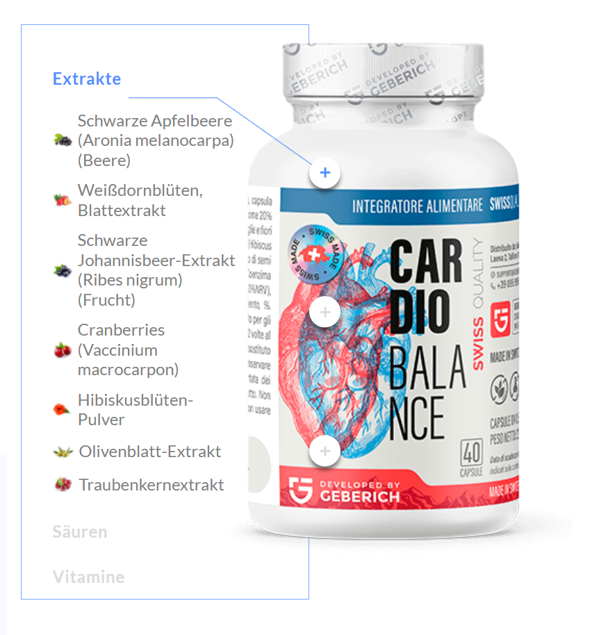 In der Zusammensetzung von Cardio Balance sind alle Komponenten ausgewogen und jede ist wichtig, aber zwei verdienen besondere Erwähnung: Es ist das Weißdornblüten-Blatt-Extrakt und das Hibiskus-Blumen-Pulver. Zusammen helfen sie, den Blutdruck zu kontrollieren und zu einer Senkung des "schlechten" Cholesterins beizutragen. "Schlechtes" Cholesterin ist das, welches sich an den Wänden der Blutgefäße absetzt, die normale Durchblutung beeinträchtigt und die Bildung von Blutgerinnseln provoziert.